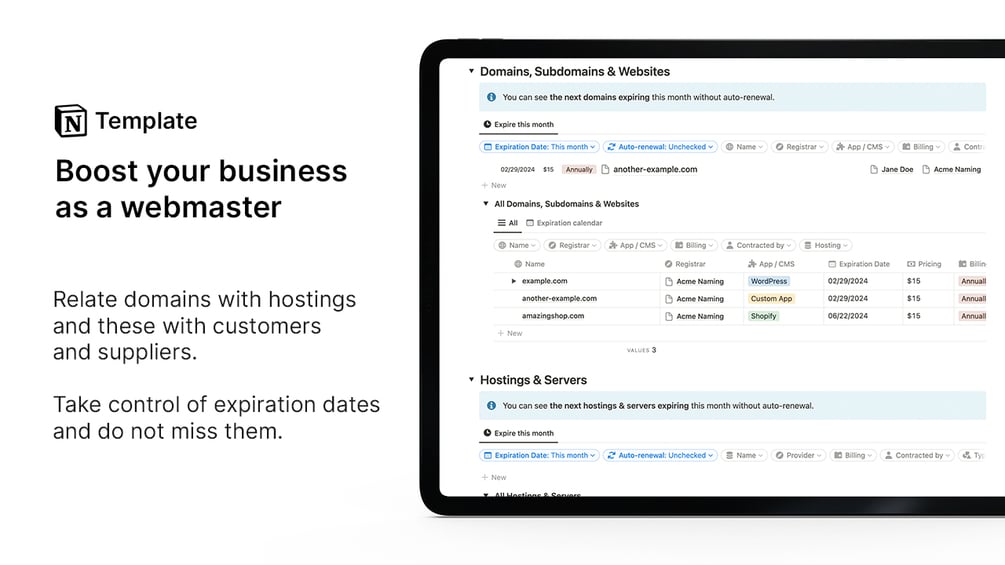 Webmaster Dashboard: Domains, Websites, Hostings, Clients & more! | Notion Template